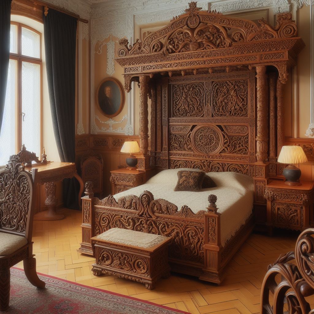 - Royal Wooden Bed – A grand masterpiece with intricate carving and polished solid wood